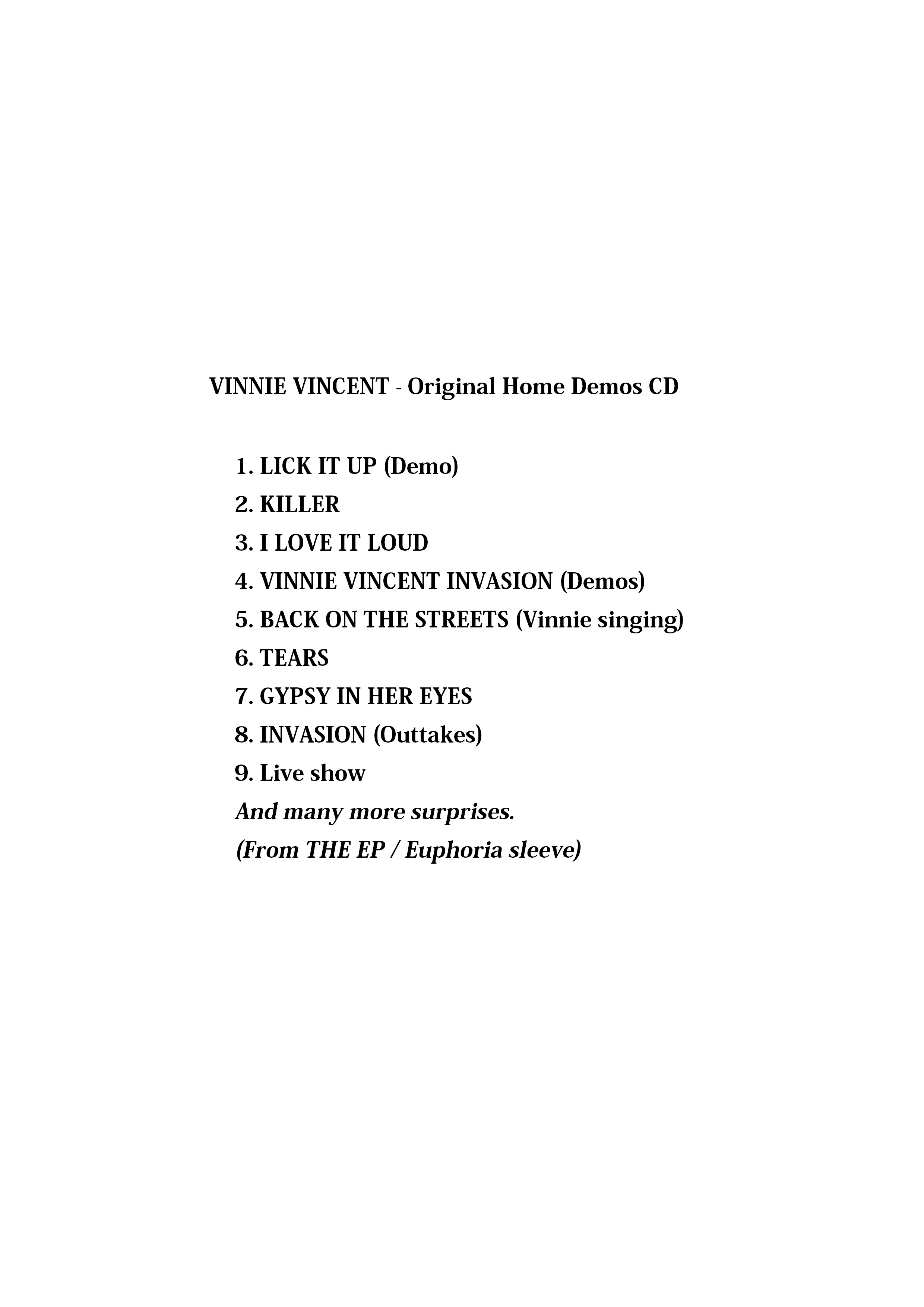 Vinnie might possibly play on "The Exorcism Of Kazcnyz". I read that he don't. Then I read that he does. Sorry about sounding sure, when I actually wasn't.toliklisiy wrote:I was looking for this single on eBay and other websites , and in addition 45 second sample , I do not find anything else . But I read on vinnie-vincent.com that Vinnie plays on "The Exorcism ..."