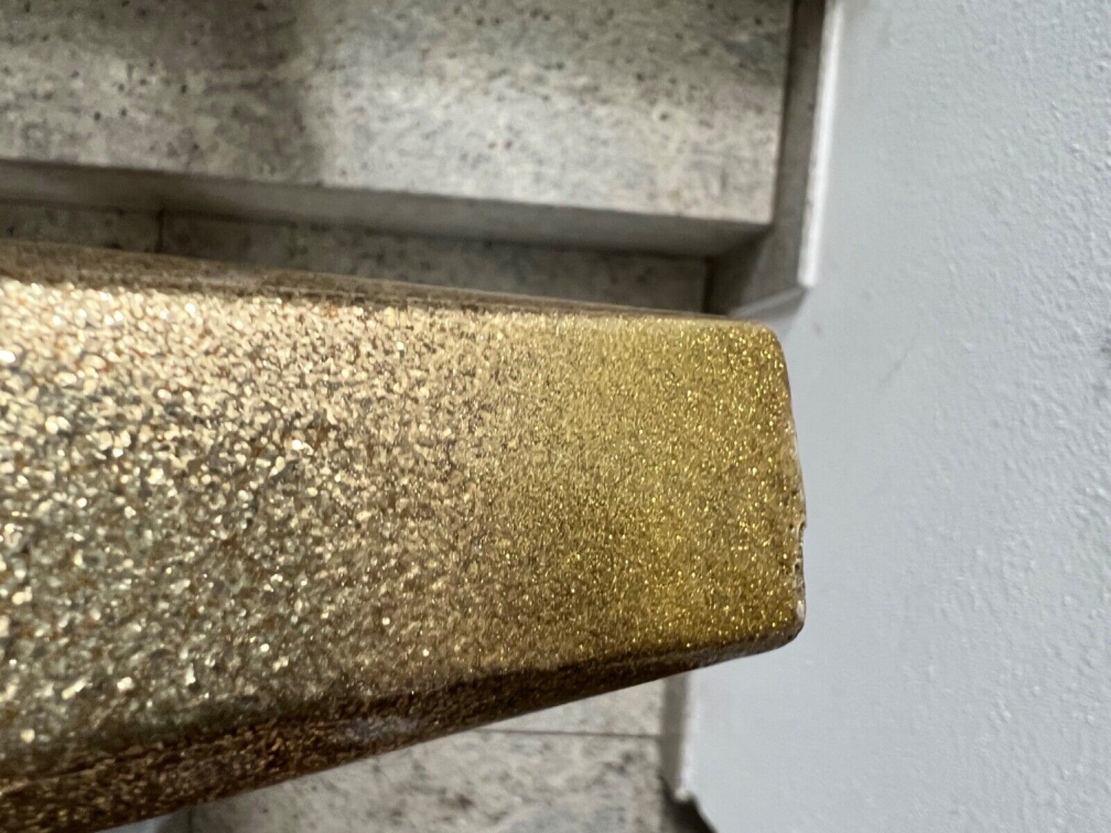 If I was a dentist :D , I would remove that gold spray and put some dental amalgam on that horn. After that, no need for flakes, just gold paint (or real gold?), and it will look as new.