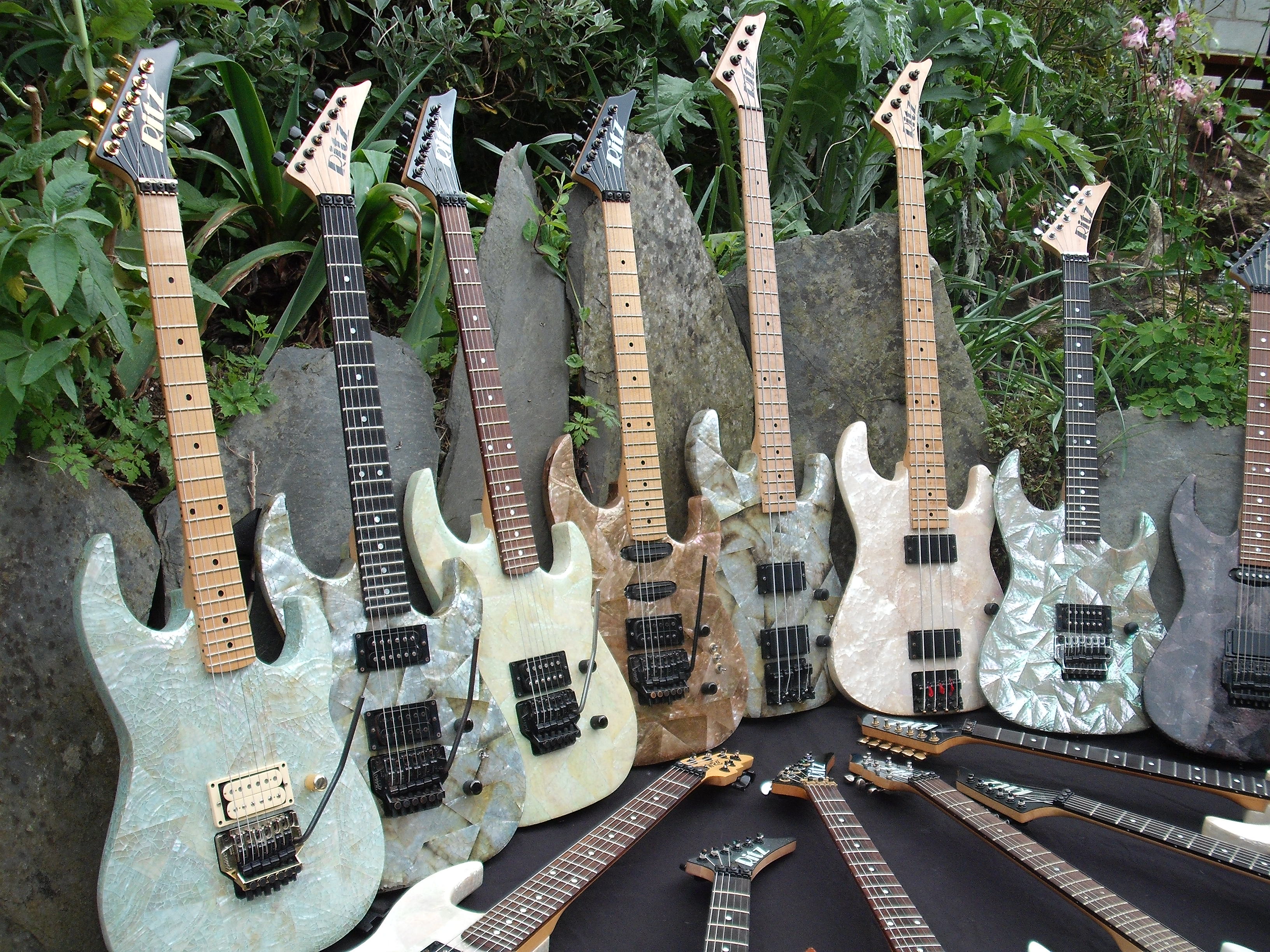 The checkered one on the ground is made up of neck left overs . Wayne said its his favourite guitar he made.