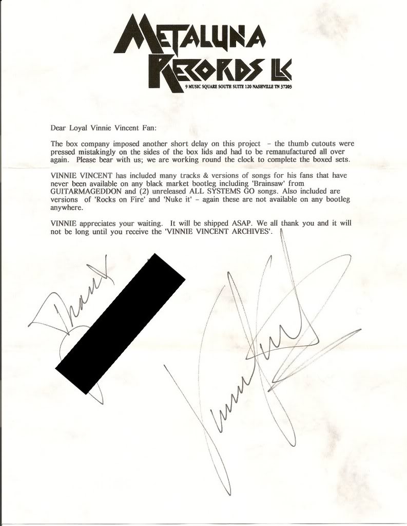 Whatever ones personal hypothesis is there were some Archive Boxes made and at least one of the empty Vinnie Vincent Archive Boxes was sold on ebay in the last couple of years and we discussed it and posted pictures either here or on the DoubleV Forum. So if the boxes existed and the music we know exists the only thing that I have never seen actual proof of was the cassettes that contained the archives and the extra items that were to be included in the boxset. I would have been cool with him and stopped slagging him if he had just packed the cassettes in a little square box and mailed them to my wife and I sometime between 1997 and 2012. I just wanted to hear the music and though it wouldn't have been everything that I paid for it would have been what I had wanted most. Think about it, I haven't moved since 1997 so he knows exactly where I'm at and has read what I have written publically about him for 14 years so all he needs to do is pack the 9 duplicated cassettes in a little box and mail them to me. No explanation, no apology nothing else is needed and I WOULD NEVER SLAG HIM AGAIN. It would probably cost him no more than $10 to do right by me but it sadly will never happen. Once again he hates us because he cheated us and no one did him any verbal harm until he cheated them 1st.