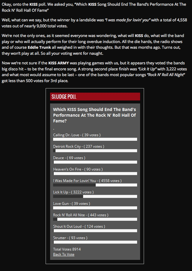 http://www.metalsludge.tv/?p=42584 wrote:Now we’re not sure if the KISS ARMY was playing games with us, but it appears they voted the bands big disco hit – to be the final encore song. A strong second place finish was