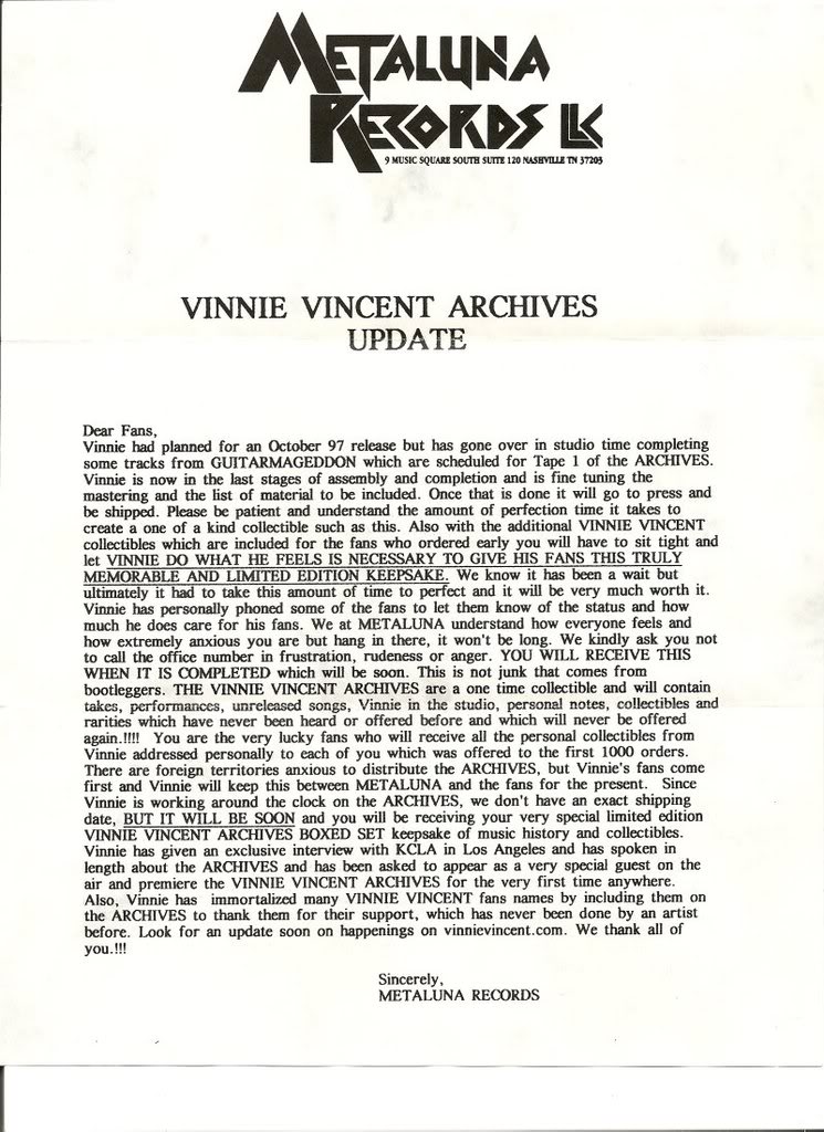 When Vinnie originally introduced the "Vinnie Vincent Archives" it was originally going to be 6 cassettes but as the delays grew he advertised that it was going to be expanded to 9 cassettes for the same price. There was at least one box made and here is proof of that. There are more pictures somewhere of the sale that occurred in the last few years on Ebay.