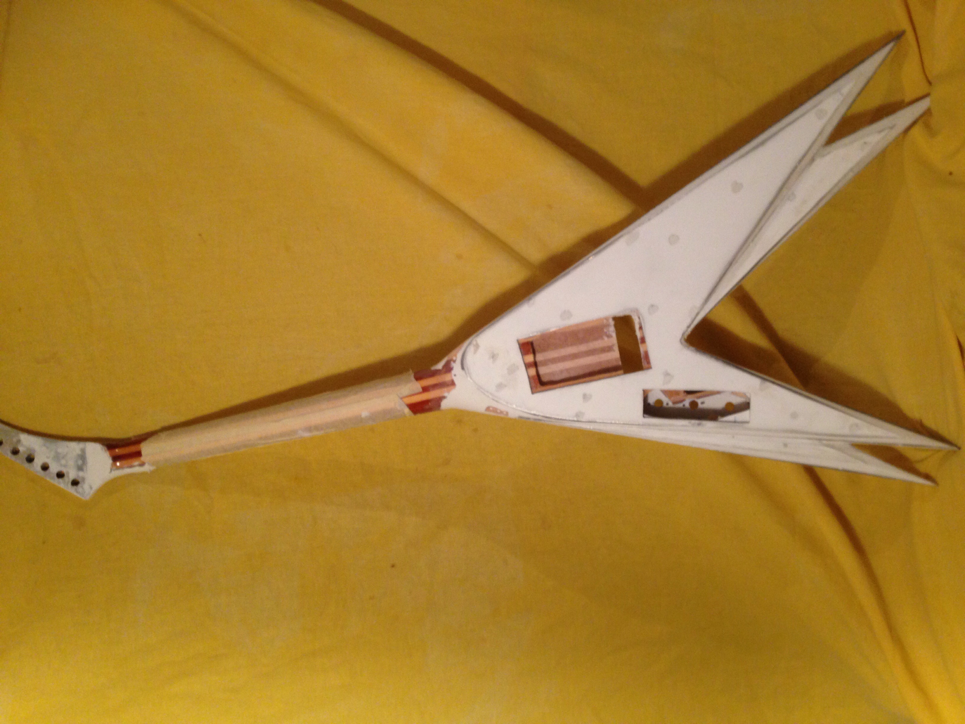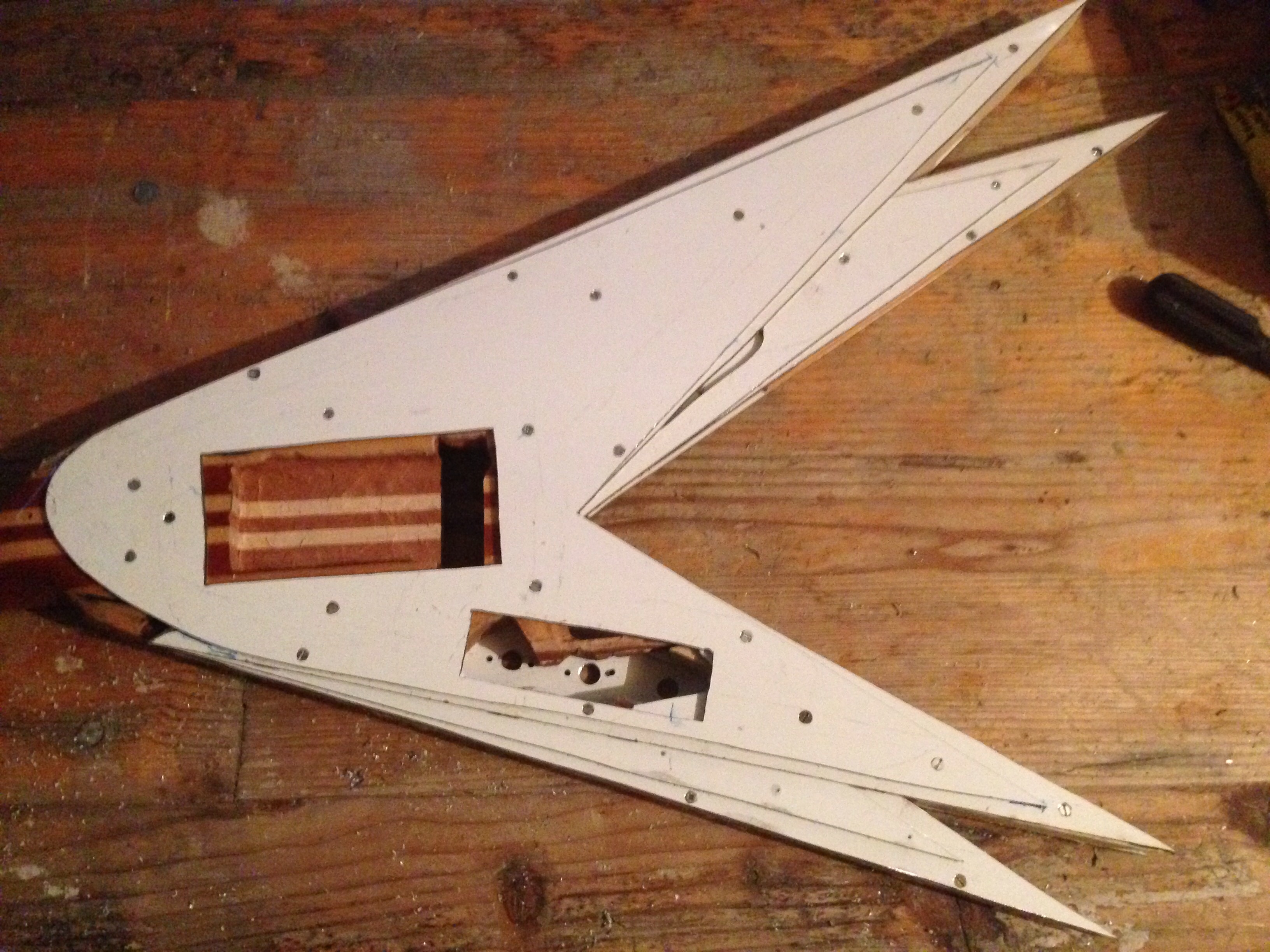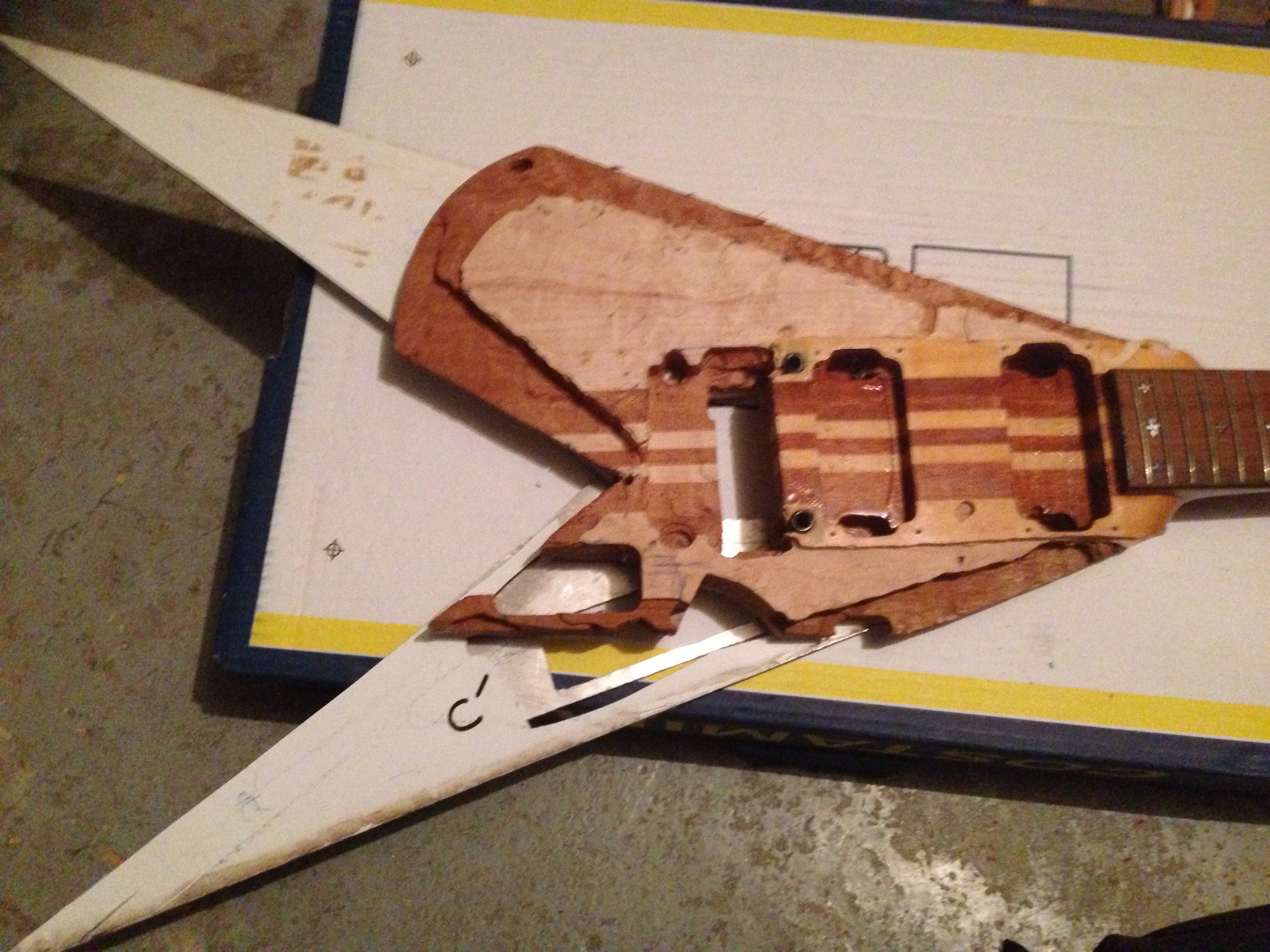 This is going to be fascinating to see what the finished product looks like and sounds like. This may be the first attempt known of a guitar modified into a Double V?