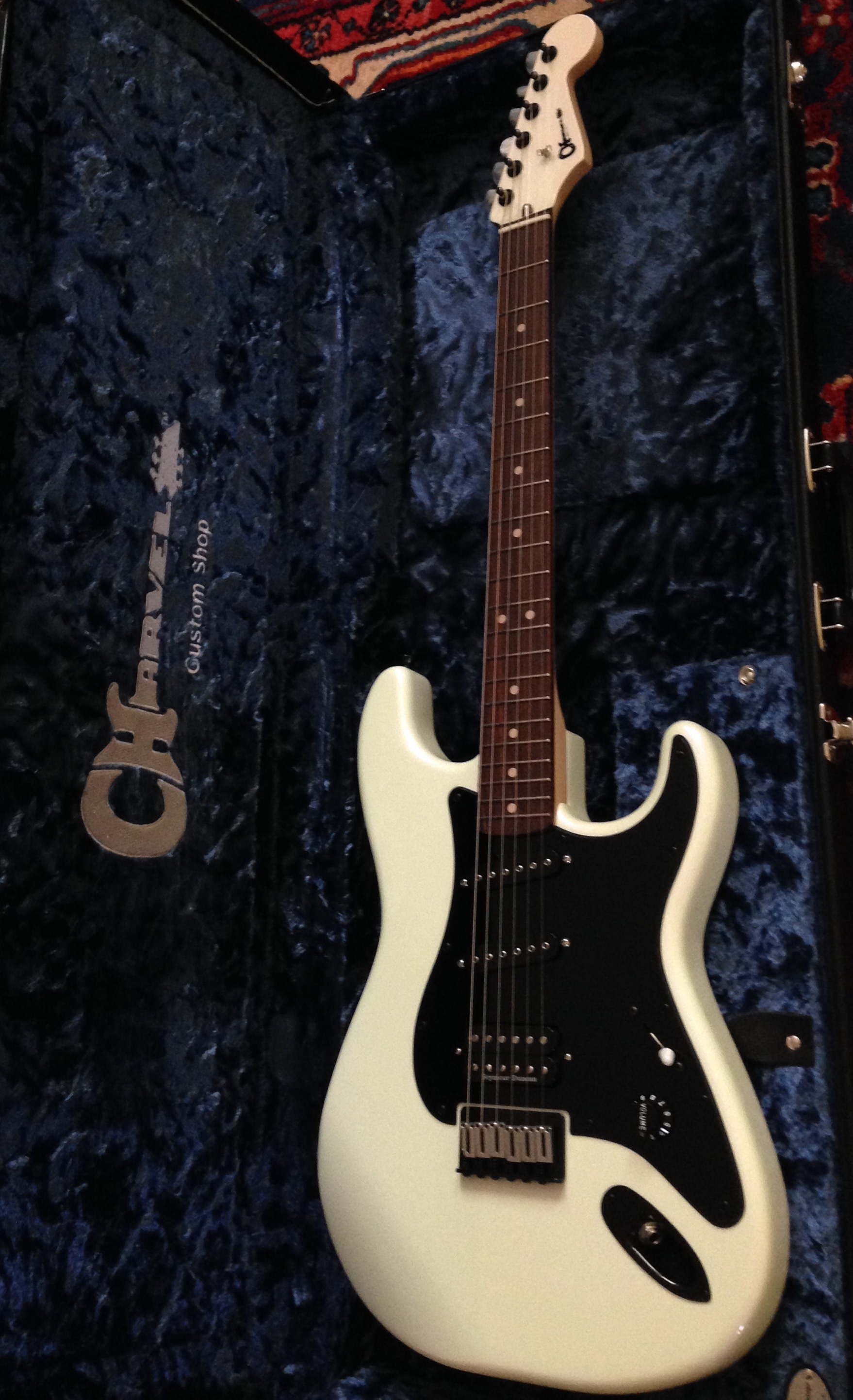 Thanks, I knew you would like it! ...Charvels, Charvels... No flames here, but an amazing pearl white color. It only weighs 3.25 kgs : no trem, no tone knob.