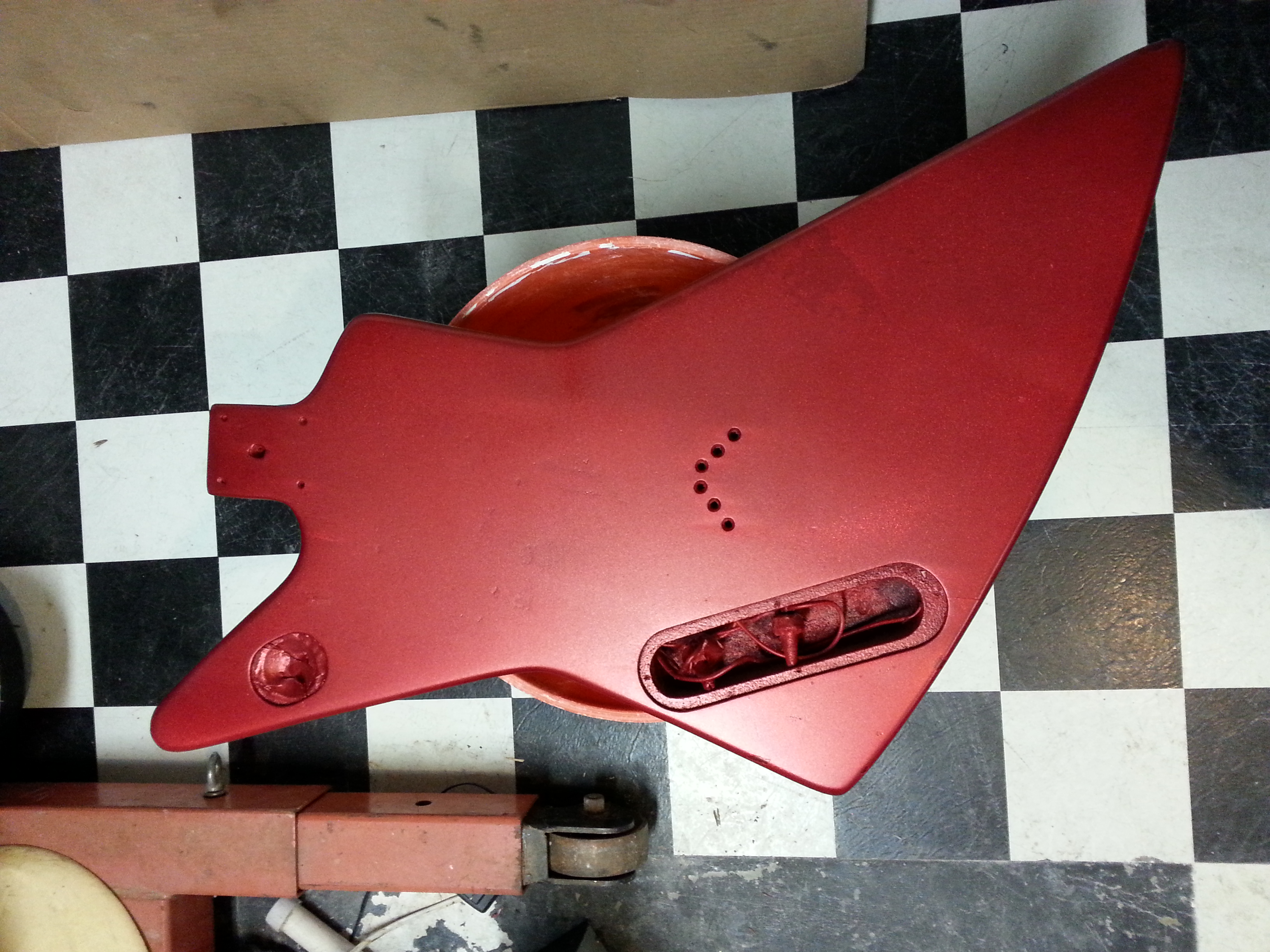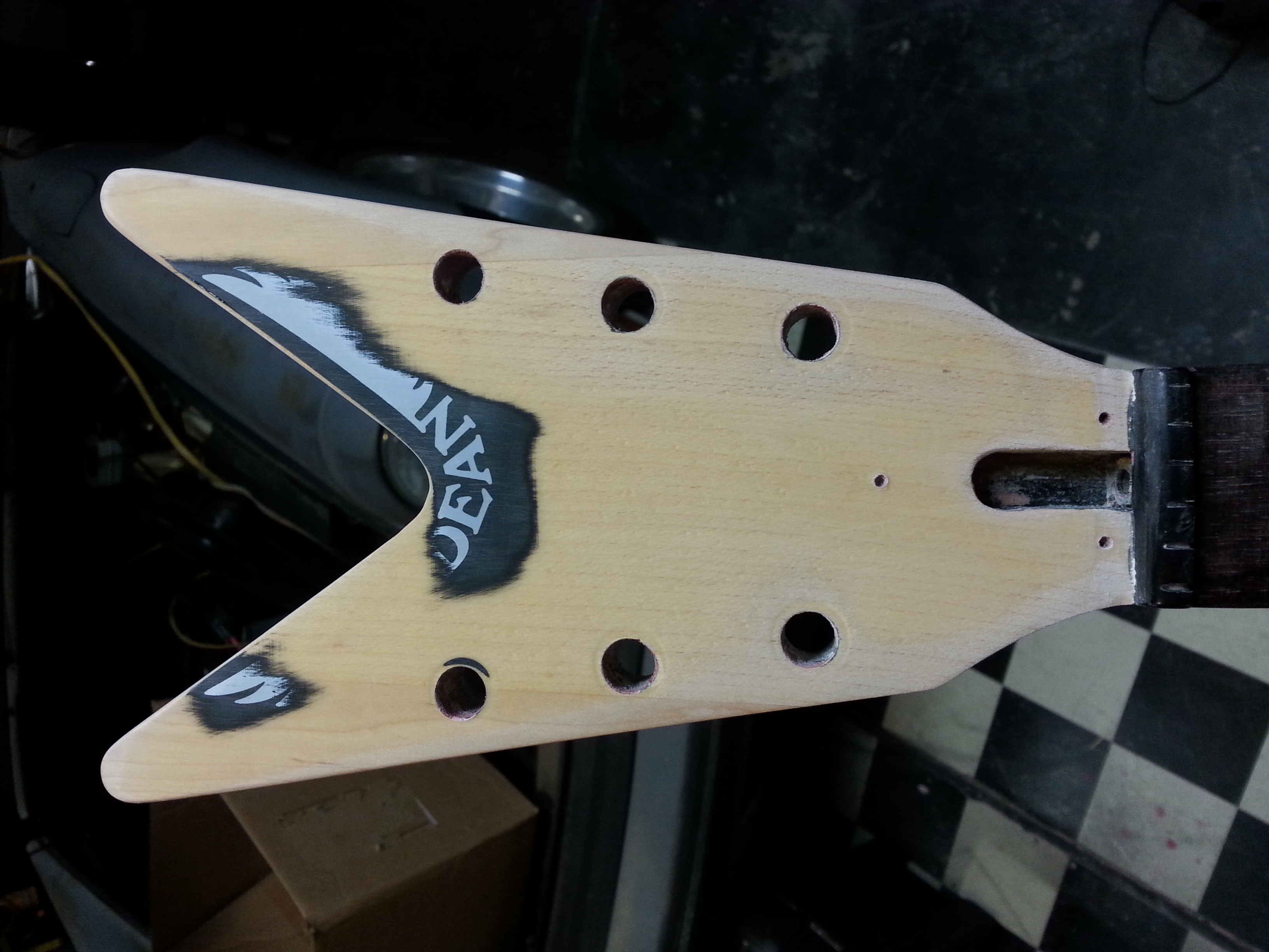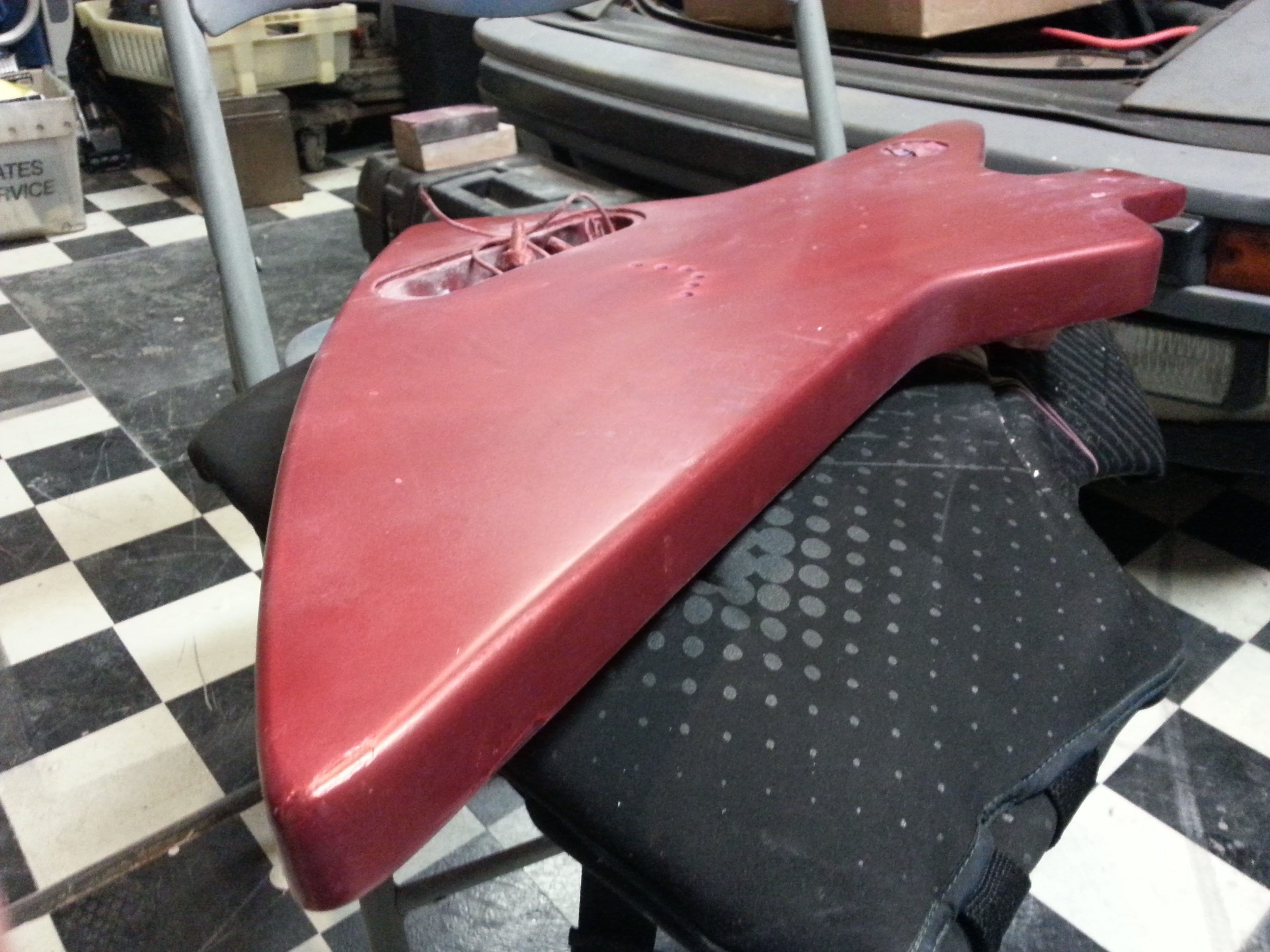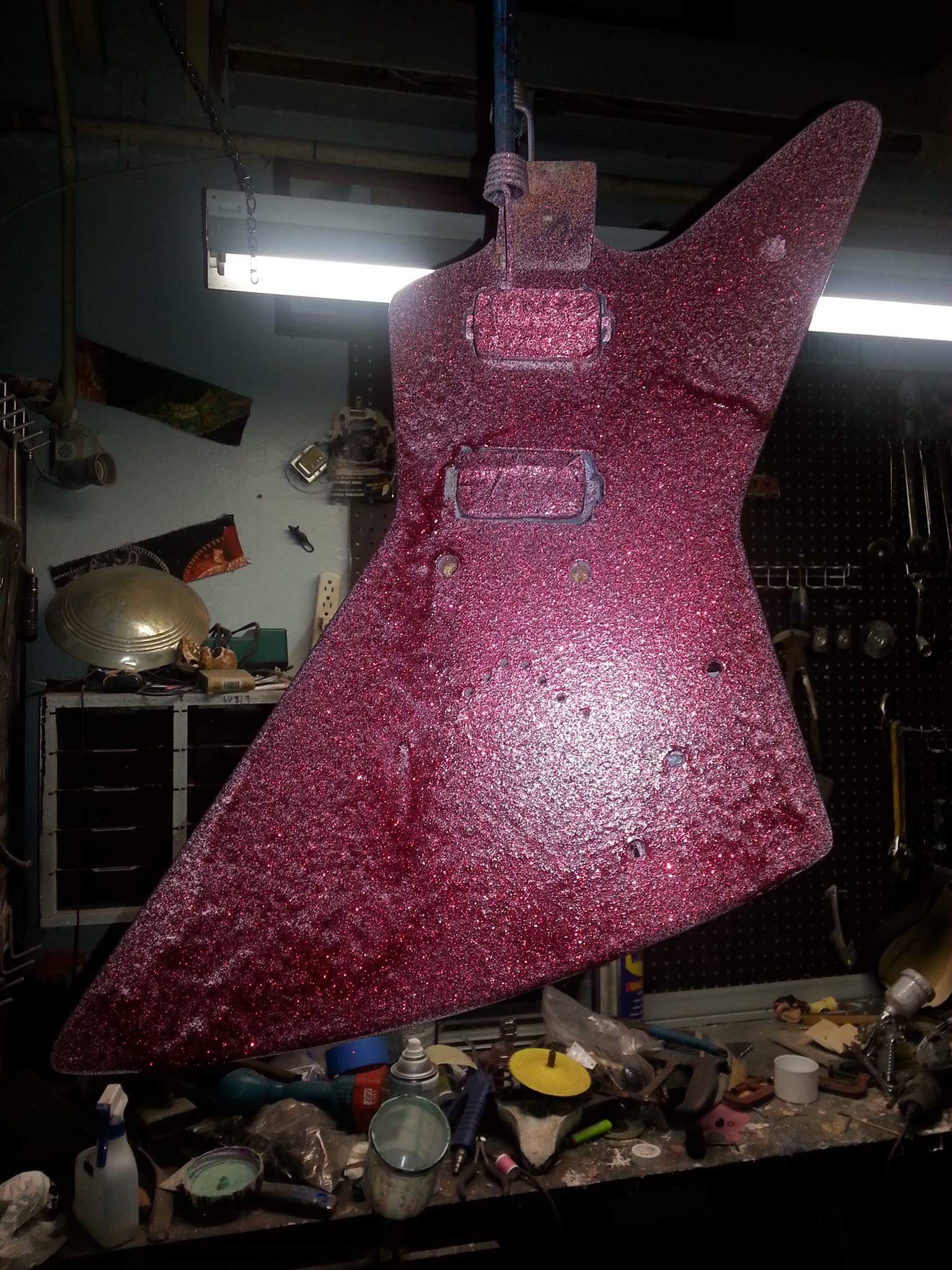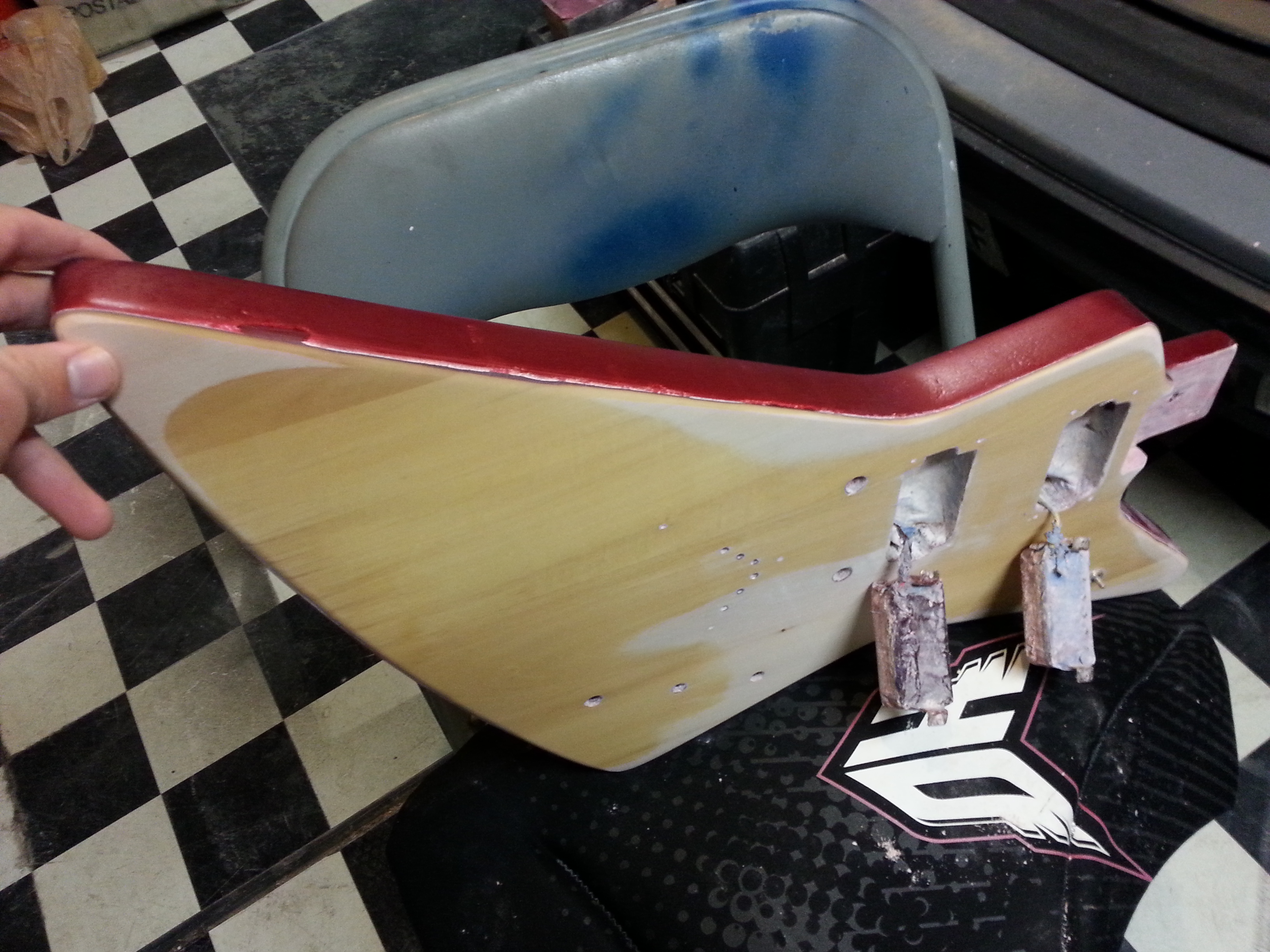 I stripped the guitar to its base on the front by hand, leaving the sides and back painted. I also stripped the headstock and left the winged logo with a burned effect (the original blueprint for an Explorer showcased the now famous Dean version). I beveled the edges by hand and applied more red pearl overy the flake to give it a deeper look. The sides are pretty chunk from the stripper, as I had no intention of leaving the original color. It gives it some charcter looking appropriate given the age. I wet sanded the neck, thinning it a good inch for less action and way more slick feel. The necks feels as thin as a Mosrite would now. It has a bit off buzz, but with 10s it pretty stiff and feels like a Jackson or higher end Dean would. I rewired new pick ups and sanded the frest lightly with mineral spirits. The clear coated the front and headstock, but I left the neck bare on the back for smoother feel.